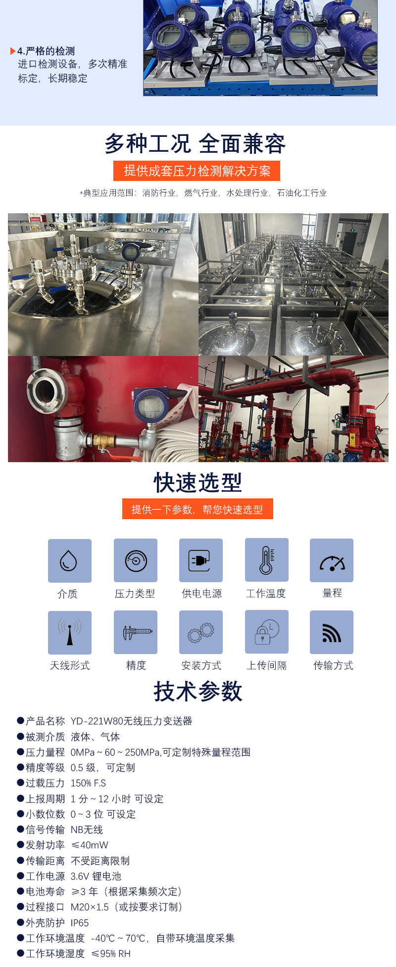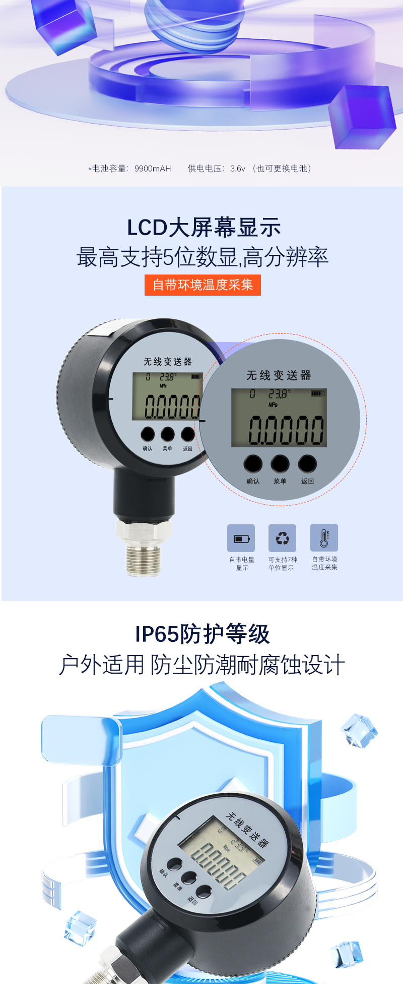 本無(wú)線(xiàn)壓(yā)力(lì)變送器(qì)屬於無線監控係(xì)統的配(pèi)套產品,適用於生產、儲運工藝過程的壓力監測。采用微功耗無線通訊模(mó)式,不需要接(jiē)線,安裝更為快捷、安全、方便,另有配套的無線轉接設備,可將(jiāng)諸(zhū)多無線壓力信號轉換為(wéi) MODBUS 標準信號通過以太網或串口(kǒu)傳輸,能夠方便的接(jiē)入測(cè)控係統,有著廣泛的應用(yòng)層麵。
