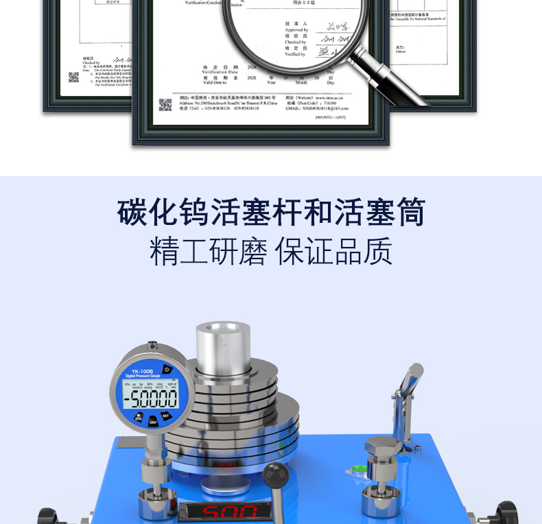活塞式壓(yā)力計做為最重要的(de)壓力基準儀器,主要用來校驗其他壓力儀表,是壓力基準儀器(qì)之一,也是目前市場上性價比最高的壓力基準設備,我廠生產的活塞式壓力計不僅僅局限(xiàn)於取得國家檢定證書,更側重於計量使用的便捷性,讓計量效率高更輕鬆是我們對於(yú)活塞(sāi)壓力計的(de)市(shì)場定位。