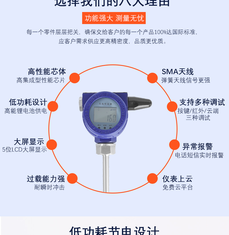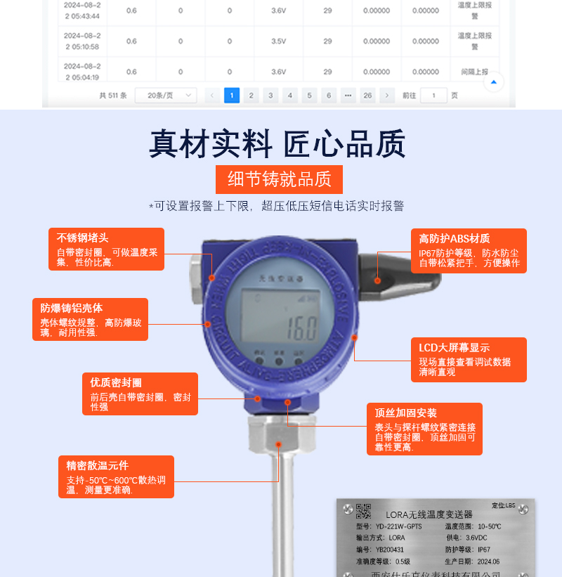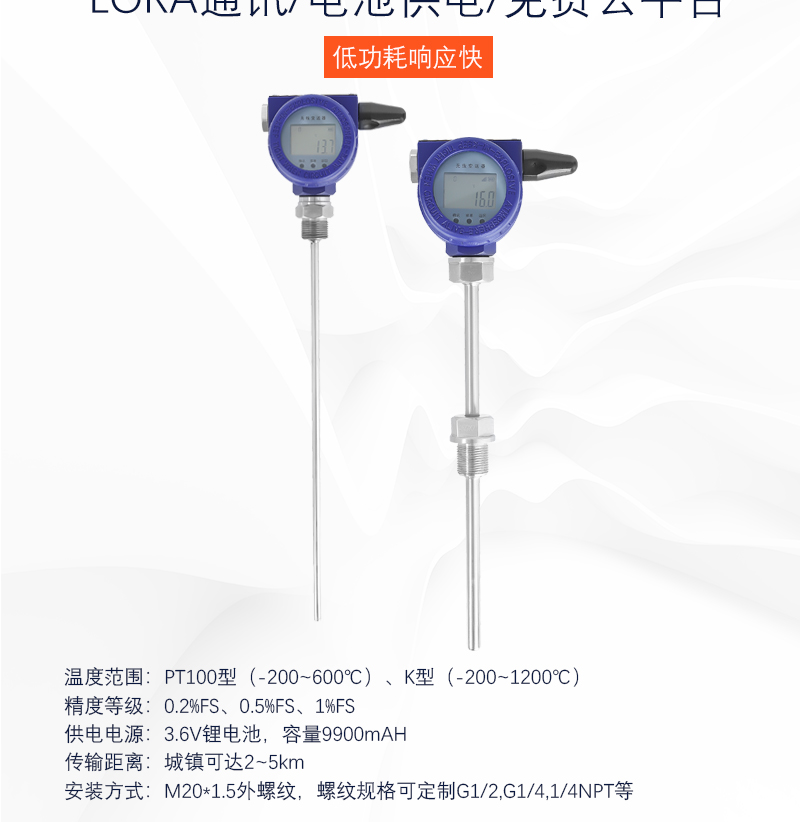 YD-211WL智能(néng)無線(xiàn)溫度(dù)變(biàn)送(sòng)器是一款低功耗、具有(yǒu)無線通(tōng)訊功能的智能儀表,以先(xiān)進 的工業級 MCU 為核心,高品質的傳感器為采集前端,結合物聯網Lora 數據模塊,該產品采用工業型(xíng)防爆殼體,在傳感(gǎn)器處理(lǐ)方麵采用隔膜式擴散矽芯體,進行多點溫 度補償,實現(xiàn)穩定的數據采集,保證數據的可靠性、準確性。帶本地LCD 數字顯示表(biǎo)頭,零點、量程調法方便;反向極性保護及限流 保護(hù);抗雷擊、抗衝擊;表體安全防爆;體積小、外形美觀、性(xìng)價比高:高精度、高穩定性、 高可(kě)靠(kào)性(xìng).