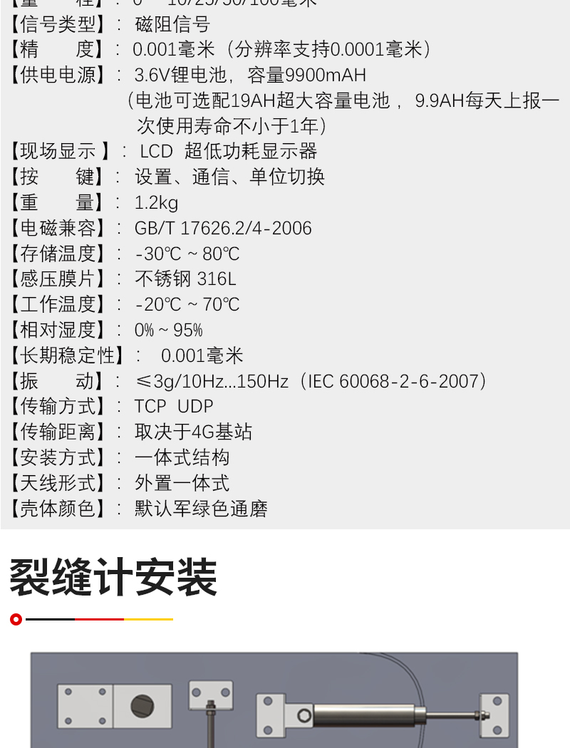 YD-223WA6 通(tōng)過采(cǎi)集位移,通過按鍵化校準(zhǔn),實現(xiàn)裂縫計無線遠傳,可通過上下(xià)限報警實現數據平台(tái)報警(jǐng)。抗雷擊、抗衝擊;表體安(ān)全防爆;體積小、外形美觀(guān)、性價(jià)比高;高(gāo)精度、高穩定性、高可靠性。