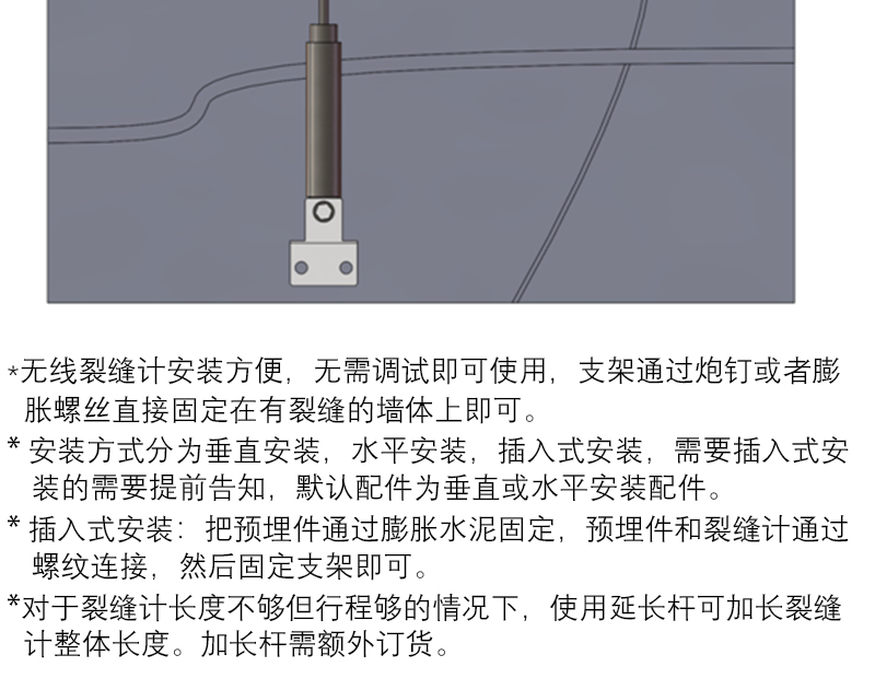 YD-223WA6 無線裂縫計用於測量表麵縫的開合度,例如:建築、橋(qiáo)梁、管(guǎn)道(dào)、大壩等混凝(níng)土的施工縫,配用不(bú)同的附件,也可測(cè)量土體的(de)張拉縫(féng)與岩石和混(hún)凝土的裂縫。儀器(qì)常用(yòng)於表麵式(shì)安裝。