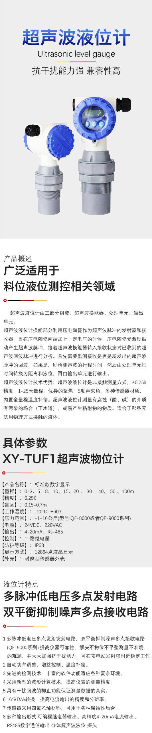 XY-F/FP分體式超聲波物(液)位儀,是我司(sī)積多(duō)年生產經驗,吸取了多種同類產品(pǐn)優(yōu)點,而開發的一款方便適用的分體式超聲(shēng)波物位儀表,解決了在惡劣(liè)環境一體機電路容易(yì)出現故障的後顧之憂。具有測量精確(què)、工作可(kě)靠、外觀大(dà)方(fāng)等優點。采用大規模集成電路,元件貼片率達90%,保證了產品的(de)長期可靠性。同時將其功耗降到(dào)了極低(dī),采用大屏幕顯示全中文菜單容易上手,支持SD卡數據(jù)采集和串口數據下載,可記(jì)錄十個幹擾回波點。