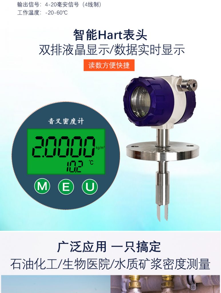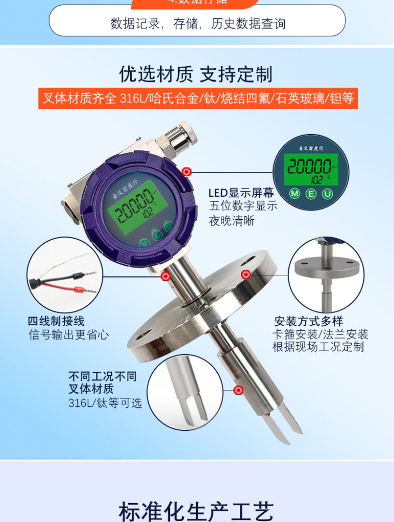 在線密度計專為鹽酸液體在線精確(què)測量(liàng)和采集(jí)應用(yòng)需要而設計。經(jīng)多年現場應用總結,根據鹽酸的特點而設計出(chū)的一款具有針對性的密度計,有效的解決了傳統在線密度計(jì)測量(liàng)中精度差、重複性不好、不(bú)變數、數據變化(huà)緩慢或數據亂跳、不耐腐蝕、不(bú)耐高濃度高溫鹽酸腐蝕等缺點(diǎn)。作(zuò)為一種隻需要極(jí)少量維護的穩定而可靠的(de)直(zhí)插型在線密(mì)度計,它(tā)們能夠提供完全一體化的“即插即(jí)用,免維護”式密度和濃度(dù)測量。硫酸專用在線式密度(濃度(dù))傳(chuán)感器(qì)可廣泛應用(yòng)於現場管道(dào)上、敞口或密閉儲存罐等工業現場,可連續、實時在線測量管道或(huò)罐體的液體密度。在釀酒業,食品行(háng)業,製藥行業和礦物加工)已被廣泛應用,具體可應用於以上行業中的硫酸密度和濃度檢測,以及多產(chǎn)品管道和罐體中的界麵檢測,攪拌混合物的密度檢測(cè),反應釜終點監測,離析(xī)器界麵檢測。
