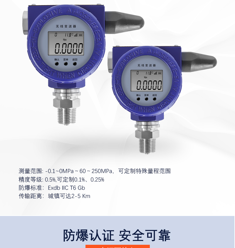 無線(xiàn)溫壓變送器帶(dài)本地 LCD 數字顯示表(biǎo)頭,零(líng)點、量程調試方便;反向極性保護及限(xiàn)流保(bǎo)護;抗雷擊、抗衝擊;表體安全防爆;體積小、外形美觀、性價比高;高精度、高穩定性、 高可靠性。