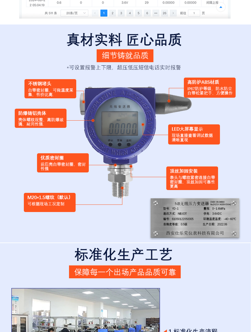采用定時傳輸和閾值報警二種方式,異常壓力及時發(fā)現,保證了管道的安 全性(xìng)。該產品采(cǎi)用工業型防爆殼體,在(zài)傳感器處理方麵采用隔膜式擴散矽芯體,進行多點溫 度補償, 實現穩定(dìng)的數據采集,保證數據的(de)可靠性、準確性(xìng)。