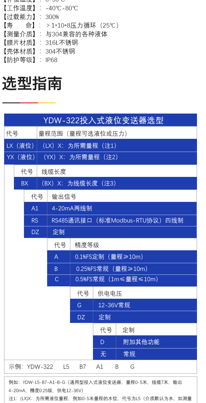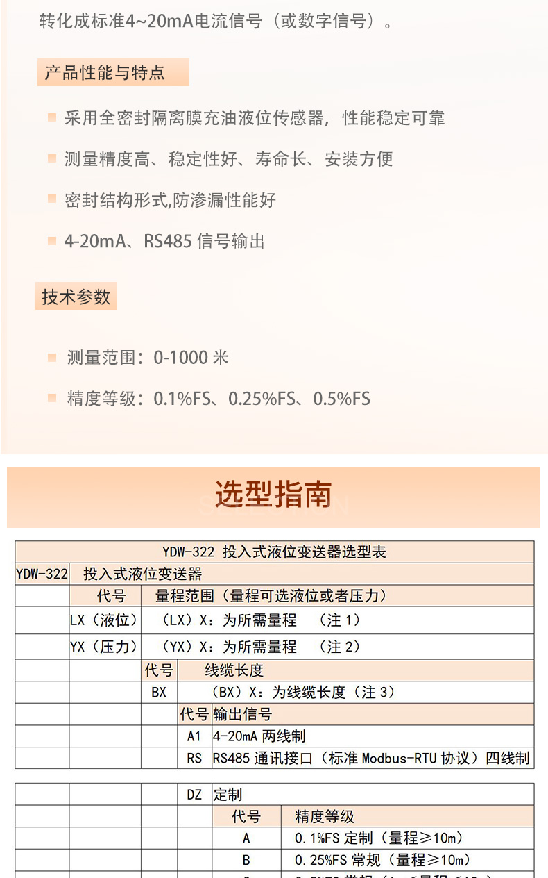 YD係列隔膜(mó)式液位變送器采用國(guó)際先進水平的擴散矽傳感器芯體,配合高精(jīng)度電子元件,經過激光調阻和溫度補償,線形補(bǔ)償、信號放大、V/I轉換、壓(yā)力過載限流等(děng)工(gōng)藝過程嚴格裝配而成,並通過長期老化及穩定性等(děng)工藝考核。具有(yǒu)抗過壓、過(guò)流、反向(xiàng)、雷擊和電磁幹擾等(děng)功能。適用(yòng)於敞開溶液的液位測量,石油、化工(gōng)、煤礦、電力、水利、醫藥、食品、輕紡等領域對氣體、液體壓力自動化測量、液位測量與控製等其他所有工(gōng)業場合。同時是一款性價比相當高的產品。可根據(jù)客戶需要(yào)帶現場LED、LCD表頭顯示,並輸出工業標(biāo)準的(4-20)mA信號,0~100%線性指針表等。同時可根據(jù)客戶要求提供智能(néng)HART通訊輸出。